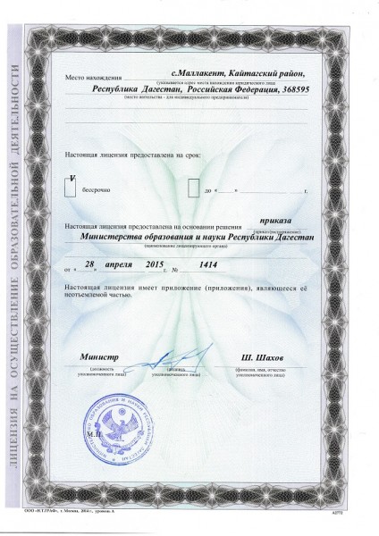 | Адрес местонахождения образовательной организации* | 368595, Республика Дагестан, Кайтагский район, с.Маллакент, ул. Лесная 32. |